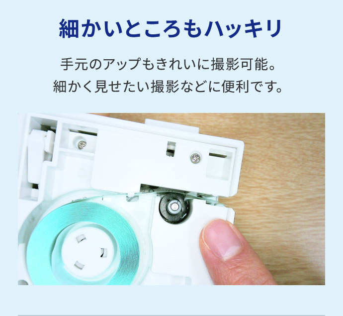 撮影中に自由にアングルを変えられるので、手元のサンプルや資料をアップにして、細かく説明するのに便利です。