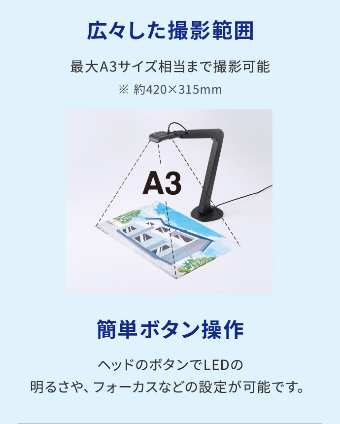 | 撮影範囲 | (真下撮影時)最大A3相当 約420mm×315mm |