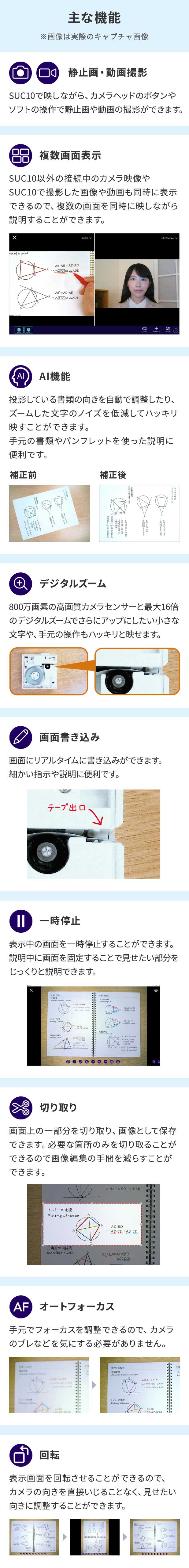 明るくきれいに撮影できるので、オンライン授業にも使えます。また、広い教室などでもPCにつなげて投影すれば、手元の見にくい動作や資料もアップで投影でき、授業効率もアップします。