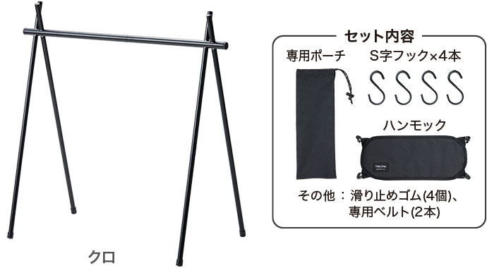 | セット内容 | ハンギングラック本体、 専用ポーチ、 ハンモック、 S字フック(4本)、 滑り止めゴム(4個)、 専用ベルト(2本) |