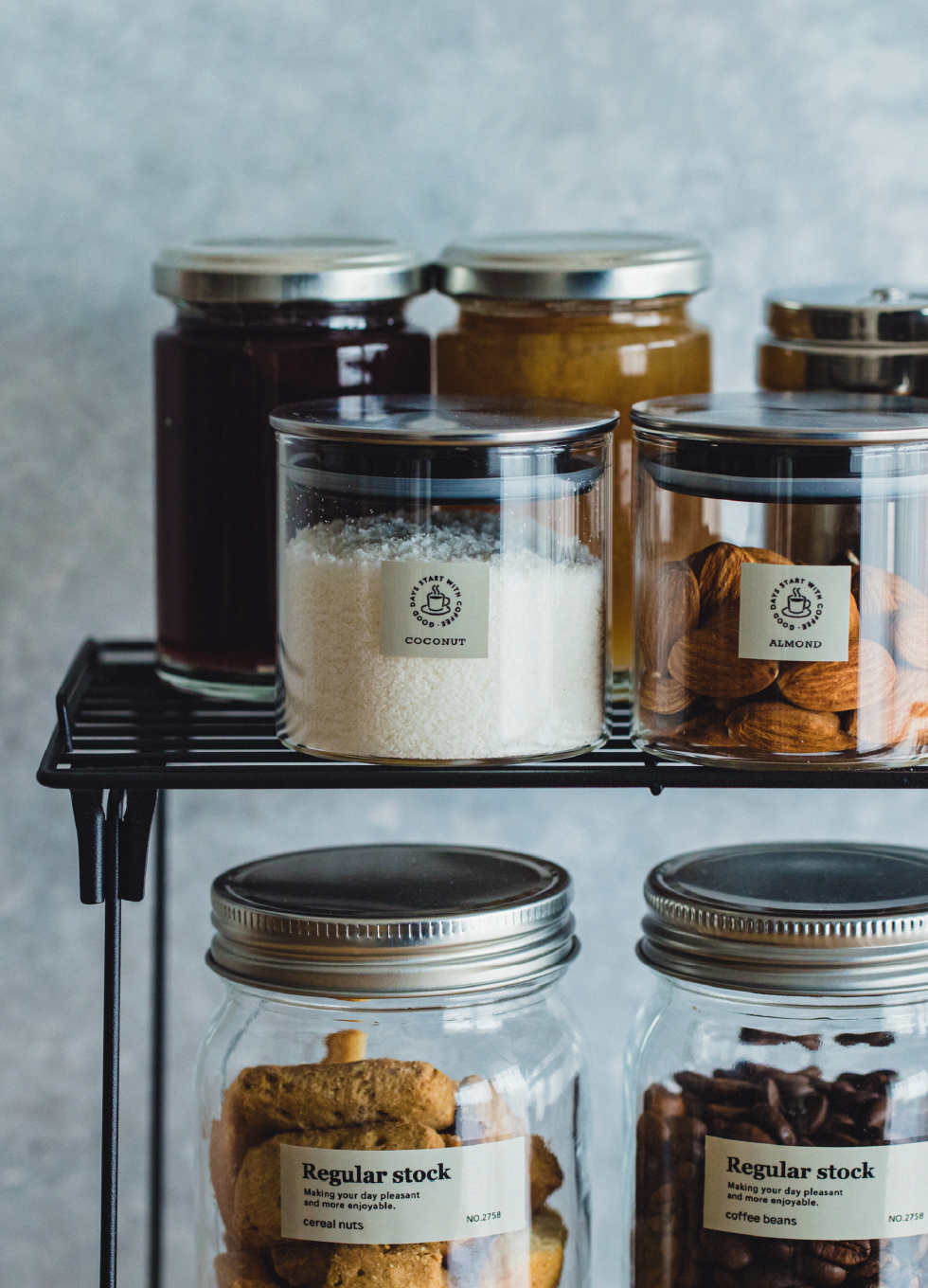調味料のラベルを英語で揃えると、まるでカフェみたい。連番併記で、戻す位置も明確に。