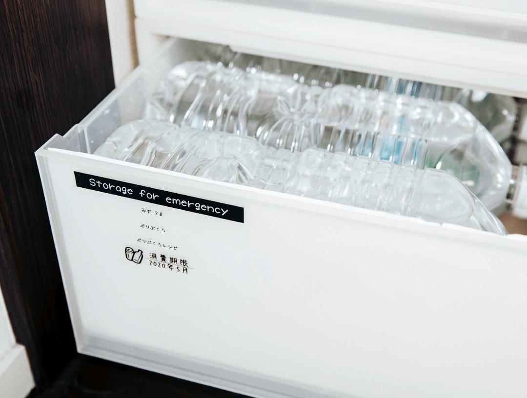 「家族を守る」収納整理収納は、家族を守ることにもつながります。だからこそ、もしもの時にさっと出せる、そして、備えがあることを忘れない収納法が大切です。水などの備蓄は消費期限があるので、「循環型備蓄」を採用しました。消費期限を印字したラベルを貼って備蓄場所の手前にしまっておけば、「棚卸し」も簡単。期限切れの前に、忘れずに使うことができます。