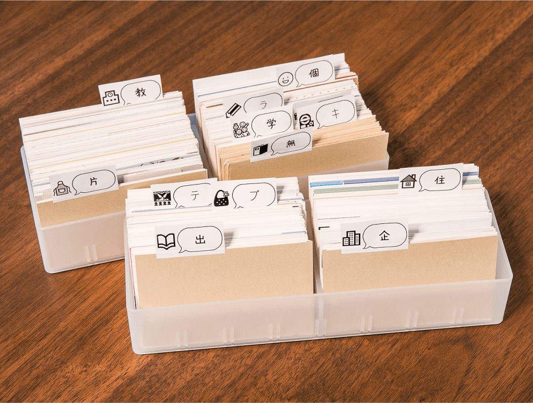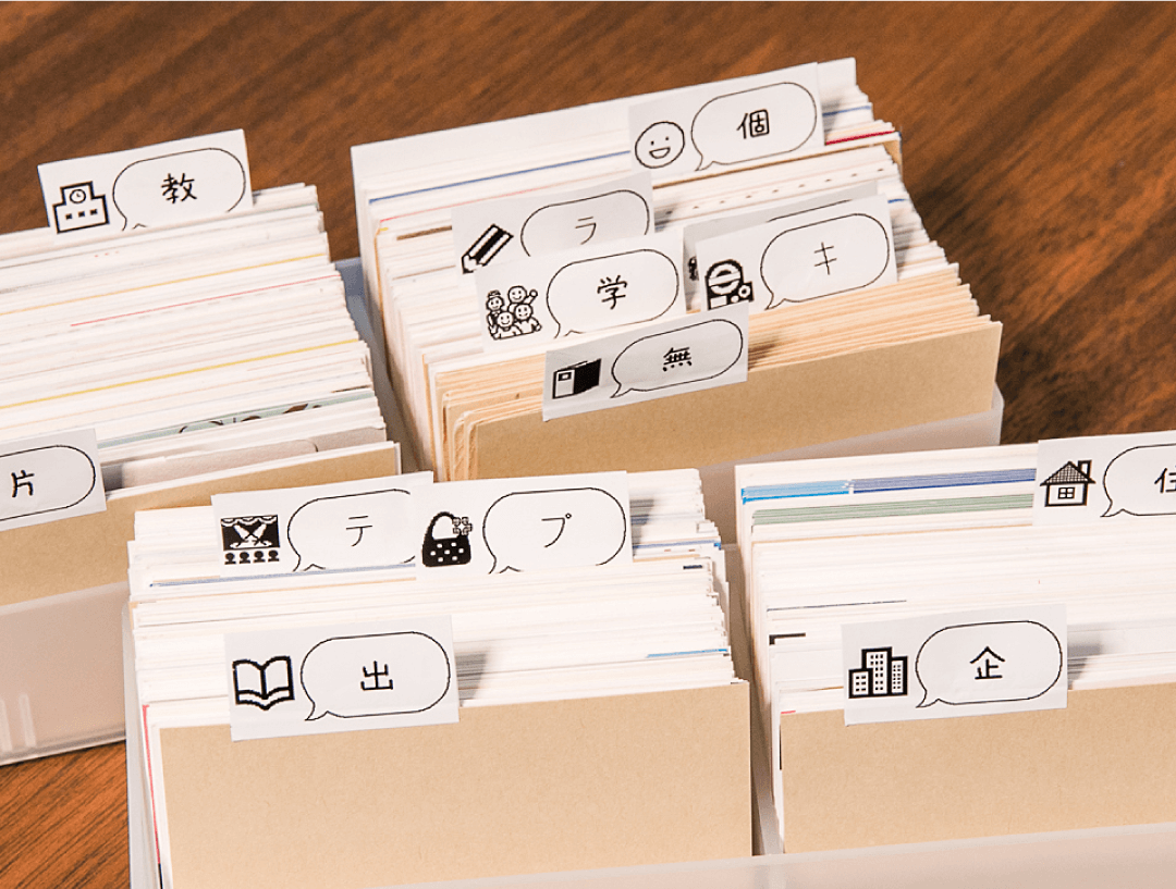 煩雑になりがちな名刺管理も、私は「ガーリーテプラ」に頼りっぱなし。データ化する方法もありますし、アルファベット順など分類方法もいろいろありますが、めんどくさがり屋の私には、この方法が最適。「出版社」などの業種別、あるいは、「プロデュース」など仕事内容で大別して、頭文字と絵文字のインデックスを貼っておけば、探し出すのも整理するのも手間どりません。