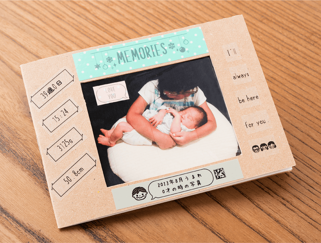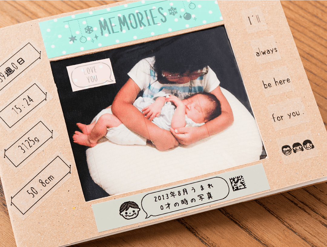 「テプラ」で実現する写真管理赤ちゃんの頃はつい写真を撮りすぎて、整理に困る……。そんなお悩みにも、「テプラ」は応えてくれるんです。「ピッとコード」※という、iPhoneなどの端末内のデータを「テプラ」で作成した二次元コードにひも付けられる専用アプリ(無料)を使用すれば、アルバムに入りきらないけど削除したくない写真をテーマやシーンごとに分類してデータ保存し、アルバムとリンクさせることができるんです。保管場所もダイエットできて、一挙両得です。