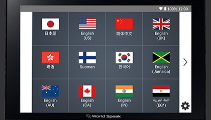 - 112言語を瞬時に翻訳し、外国人の方との難しかったコミュニケーションが簡単におこなえます。画面をスライドすると次のページの言語を選択できます。