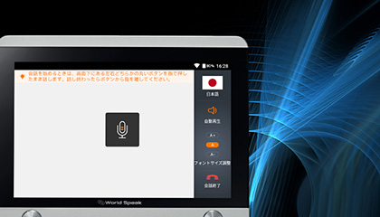 - 会話を翻訳する際はボタンを押しながら話すだけの簡単操作です。翻訳結果は大画面の液晶に表示されるテキストと音量調整可能なスピーカーからの音声の両方で伝えることができます。