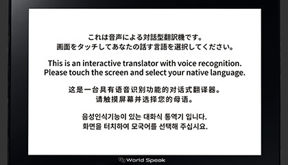 - 翻訳機であることを主要言語で表示させることで、スタッフからの説明がなくても利用してもらいやすい待機画面を作成しております。また会話画面でも会話するための操作方法を上段部分に表示させることで、初めて使う方でも簡単に利用できるような案内をしております。