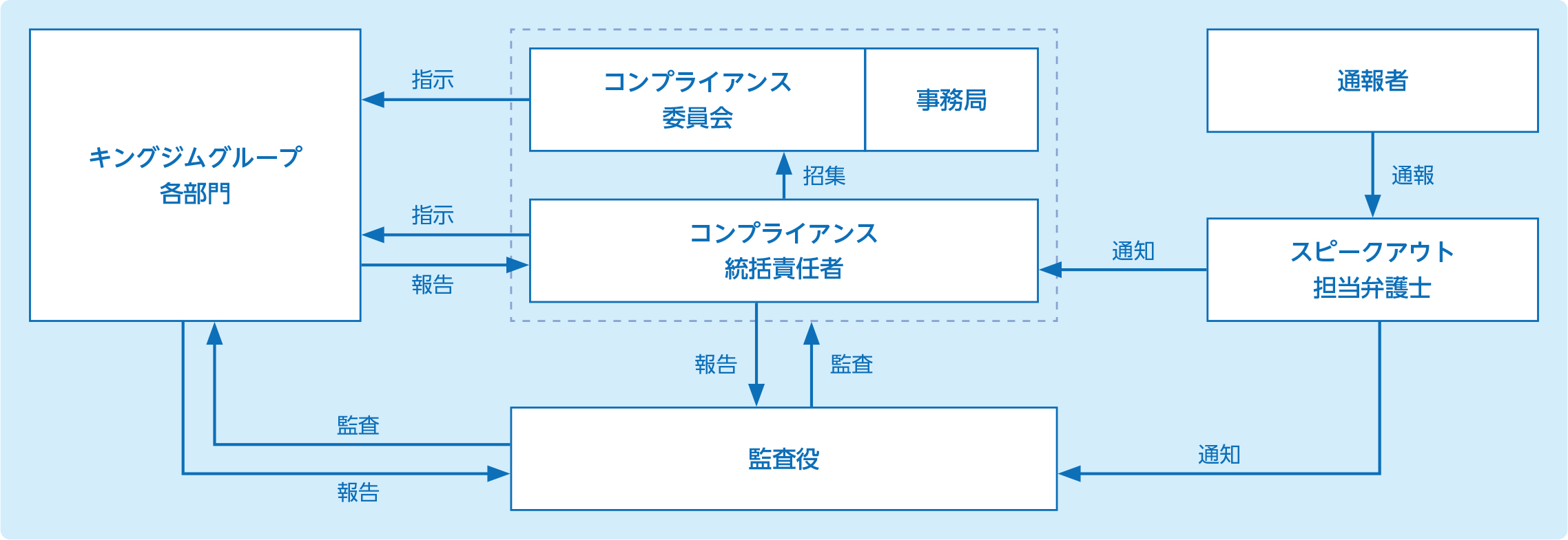 コンプライアンス委員会は、キングジムグループのコンプライアンス問題に関する、公平、公正、客観的な調査、諮問、決定機関であり、必要に応じ、コンプライアンス統括責任者が招集します。コンプライアンス統括責任者は、キングジムグループのコンプライアンスに関する総責任者として、コンプライアンスプログラムの運用、およびコンプライアンスの状況について監視し、監督します。